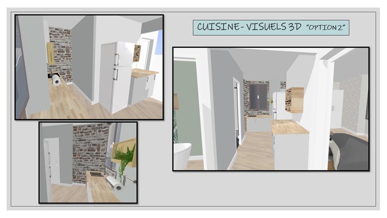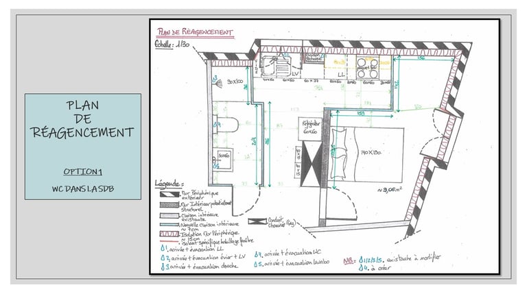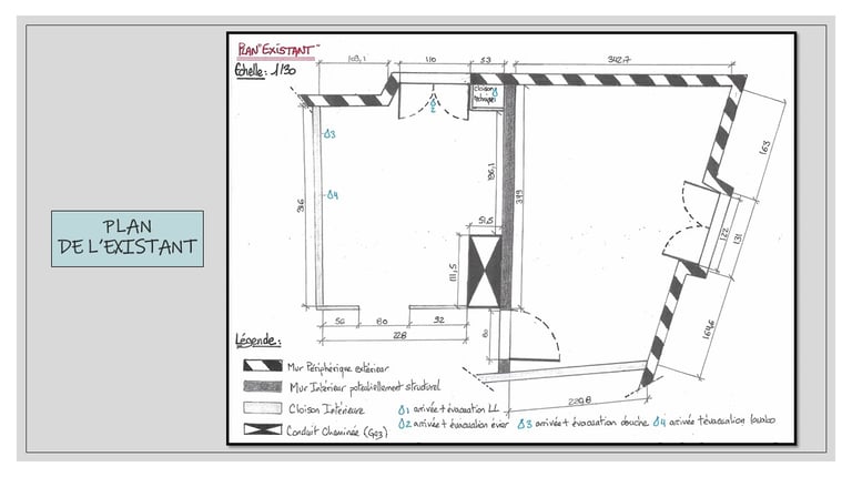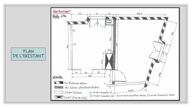 La demande de mon client: Créer une salle de bain, aujourd'hui inexistante, dans un T3 en retravaillant les espaces et les volumes. La conception de cette pièce d'eau passera par un nouvel agencement de la cuisine et de la chambre.